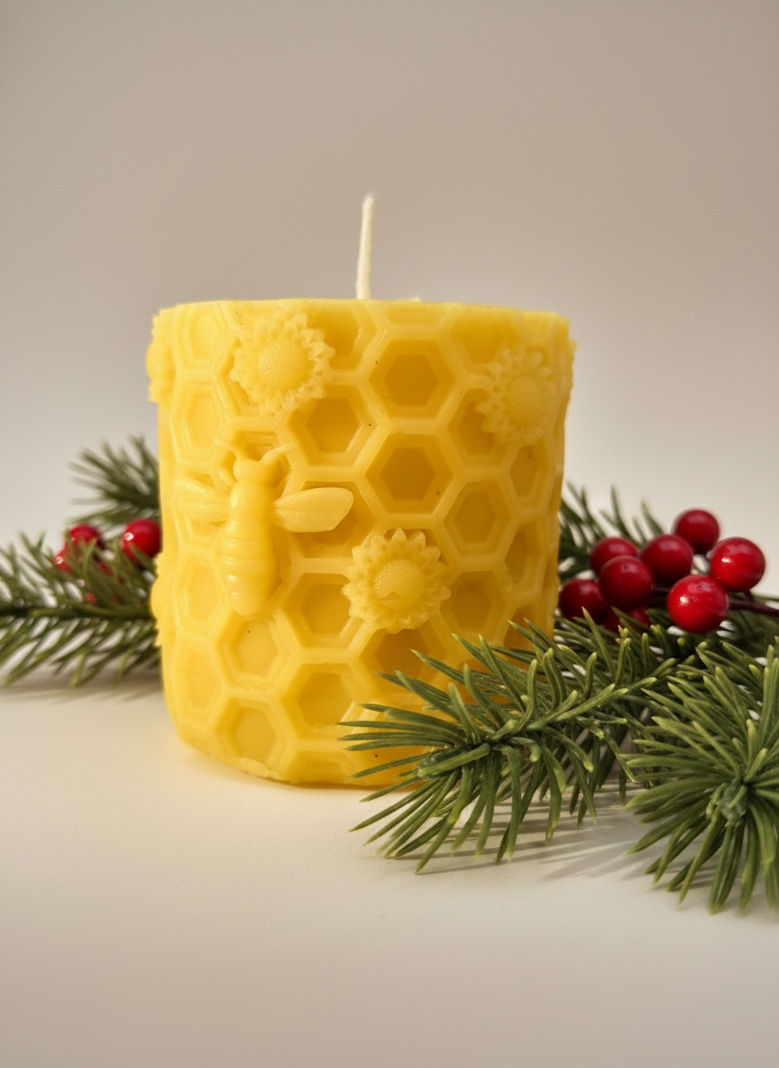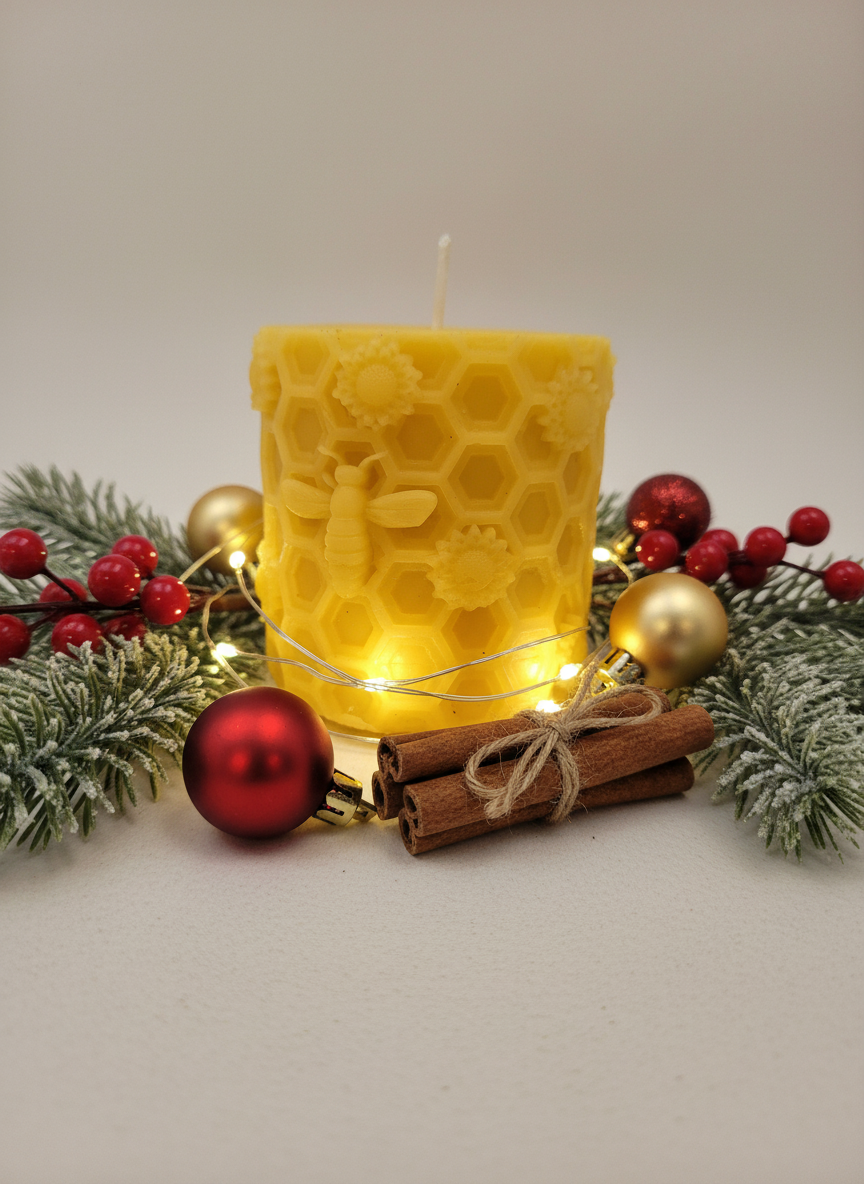 Candela Natalizia in cera d'api motivo ape su favo